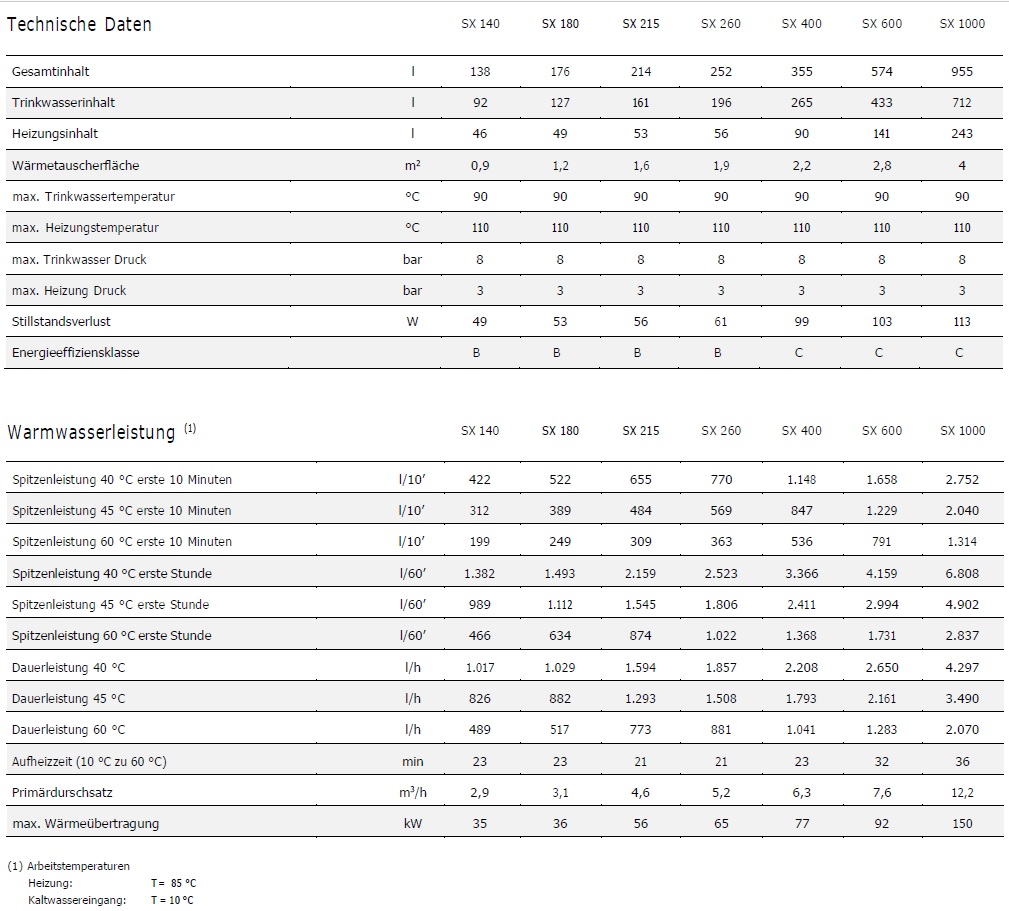 SX 180 bis SX 600 haben auf der Primärseite 4 gegenüberliegende Anschlüsse, um die Energie-Versorgung aus mehreren Wärmequellen (Kessel, Wärmepumpe, Biomasse usw.) zu ermöglichen. Die Modelle SX 140 und SX 1000 haben drei gegenüberliegende Anschlüsse.